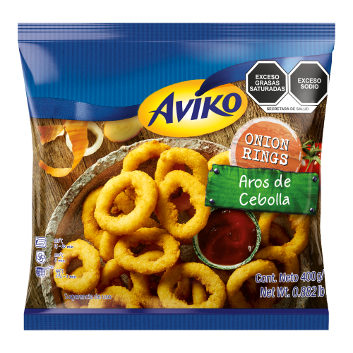 Los famosos Aros de cebolla en forma de anillo al estilo americano. Hecho con piezas frescas de cebolla, apanado y prefritos.